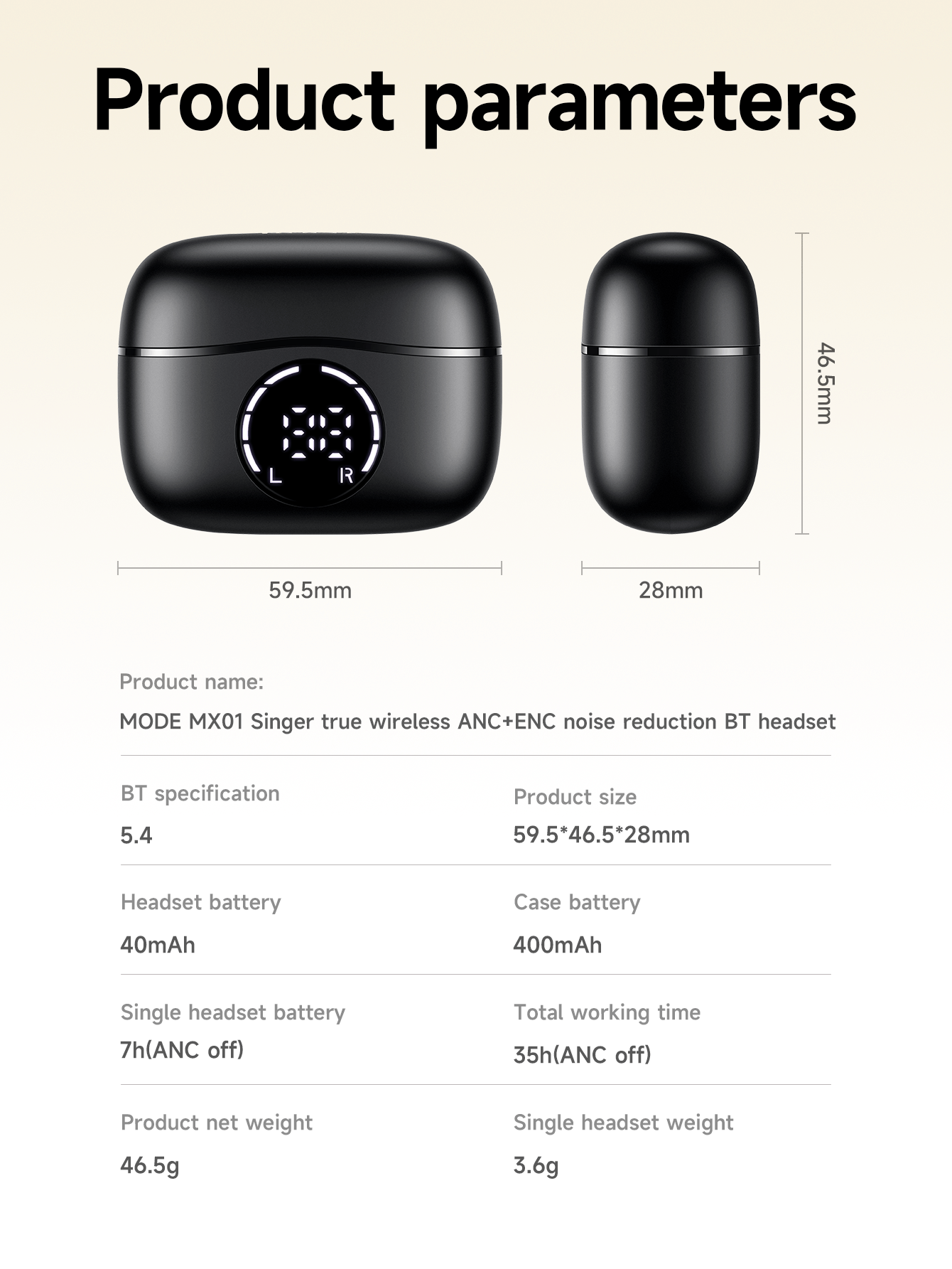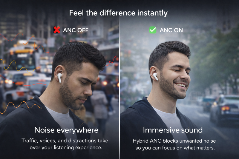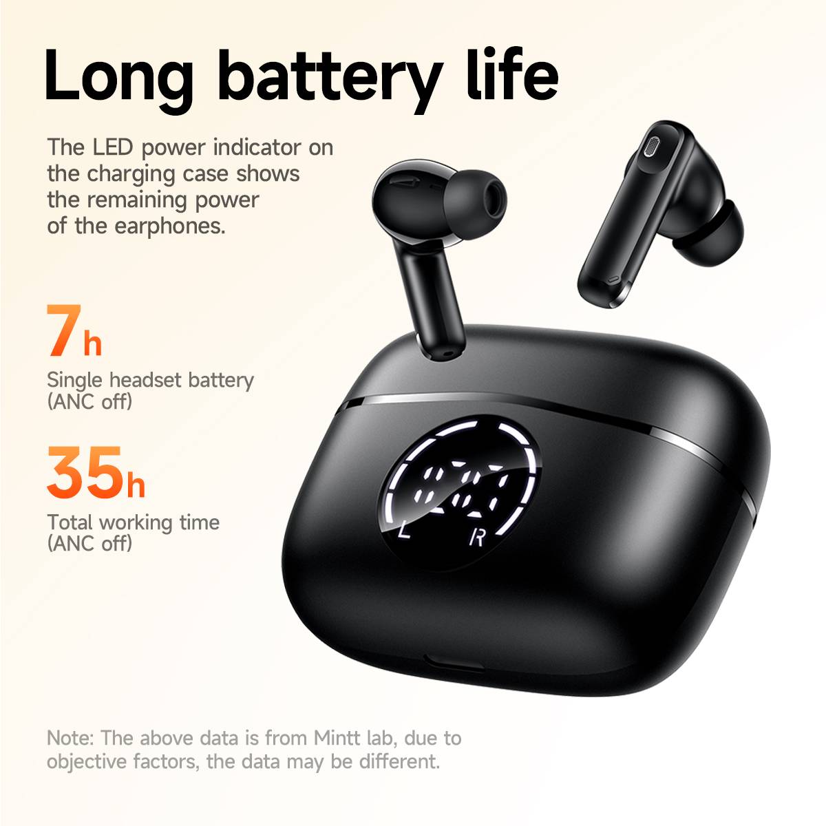 Hybrid ANC + ENC,10mm driver for deep bass, stable Bluetooth 5.4, and up to 35h total playtime.